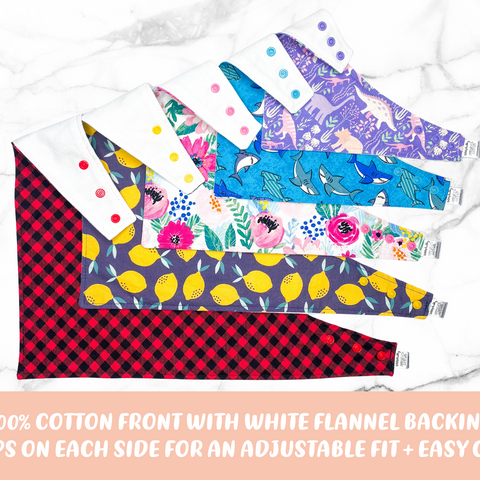 A beautifully constructed high quality dog bandana--great for your stylin' pup! BibbyBubby bandanas are backed with white flannel and equipped with three plastic snaps on each side for an adjustable fit. The flannel backing helps the bandana keep its shape and holds up better in the wash than other bandanas!FEATURES: